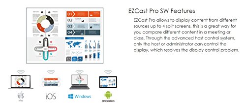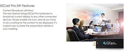 Studio : Octa Hub E-Commerce Co., Limited Publisher : Octa Hub E-Commerce Co., Limited Binding : Electronics Product Description EZCast Pro dongle is a new solution based on the popular EZCast product. Not only supports all EZCast major functions, but also comes with more brand new innovations, such as Host Control, Preferred Device, Split Screen and AirView. It integrates 802.11n 2T2R WiFi transceiver and the latest MHL 2.0 interface inside, which will bring you the best WiFi performance and convenience as well. Get the great device for your educational or conference environment now! Specification: CPU: AM8251@500Mhz DRAM: DDR3 256MB, 1Ghz NAND: 128MB Output: 1280x720 default for HDMI/MHL(Mobile High Definition Link) Resolution: (HDMI Max. up to 1080p@30p by EDID) WiFi: 802.11b/g/n 2T2R single band 300Mbps Power: DC 5V/1A, through Micro USB port (HDMI)/DC 5V/0.9A, through MHL (MHL) Video support: Max. 1080p@30p video decode, output 1080p@60/50hz LED: LED indication for Power and WiFi status Key: Internal, ADFU key for MP download Output: HDMI 1.2 or MHL2.0 Input: Micro USB Package includes - 1 x EZCast PRO Dongle body