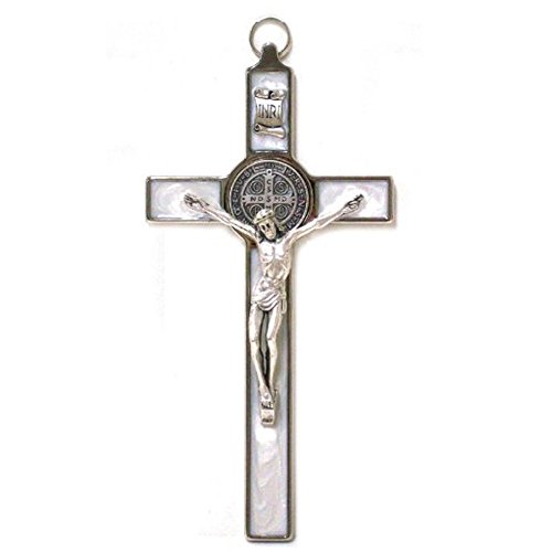 Saint Benedict Crucifix - All Metal with Inlaid Enamel and Silver Corpus - 8'' in Height - Many colors - MADE IN ITALY (White)