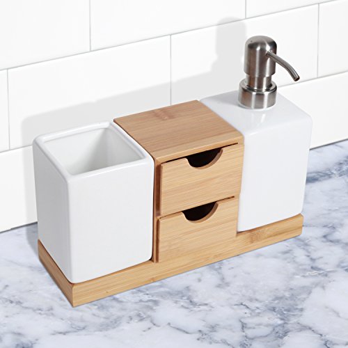 -. Feature : Made of Bamboo and Ceramic / 2 Convenient Storage draws / Includes 1 Ceramic Liquid pump and 1 Ceramic Cup