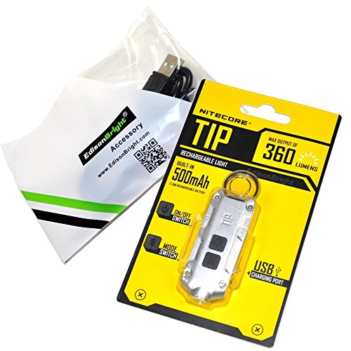 Nitecore TIP 360 lumen USB rechargeable keychain flashlight Silver color body with EdisonBright brand USB charging cable