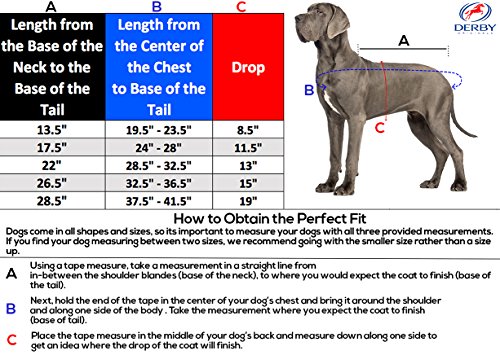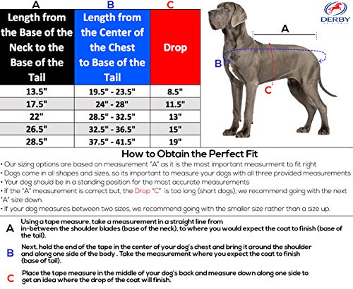 -. Binding : Misc. -. Brand : Derby Originals -. Feature : KEEP YOUR DOG WARM - Constructed with 150 grams of poly fill insulation that will dampen the harshness of miserable weather conditions from your dog. The 210 denier lining is breathable, comfortable, and durable. / HIGH QUALITY MATERIAL & DESIGN - These blankets are made to endure with a 600 Denier Rip Stop Waterproof Outer Shell. Shoulder gussets extend the range of motion so your dog can play hard without constriction. The outer shell repels water and any excess debris can be easily wiped off without staining the coat. / ADJUSTABLE CHEST BUCKLES & BELLY BAND - Create a snug fit with adjustable chest buckles and an elastic belly wrap with quick-grip closure. Refer to the size chart in the images to see the adjustability range. / IMPROVED SIZING CHART - Measurements vary from manufacturer to manufacturer. These blankets run on the larger side. Please measure your doing and refer to the sizing chart located within the images before placing your order. / FUN COLORS - There is a great selection of bright colors that will look great on your dog. -. Label : Royal International -. Manufacturer : Royal International -. PackageQuantity : 1 -. ProductGroup : Pet Products -. ProductTypeName : PET_SUPPLIES -. Publisher : Royal International -. Studio : Royal International -. Title : Derby Originals 600D Waterproof 150G Insulated Dog Blanket Coat with 1 Year Limited Warranty