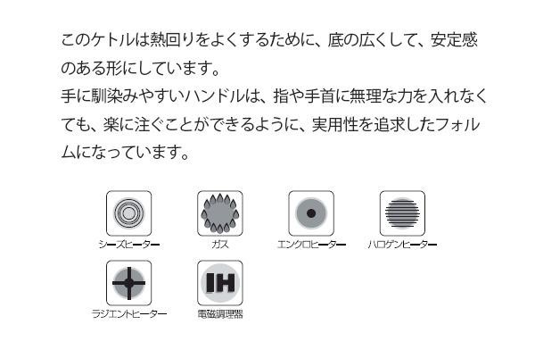熱回りを良くするため底を広くし、安定感のある形をしています。手に馴染みやすいハンドルは、指や手首に無理な力を入れなくても楽に注ぐことができるよう、実用性を追求したフォルムになっています。 |