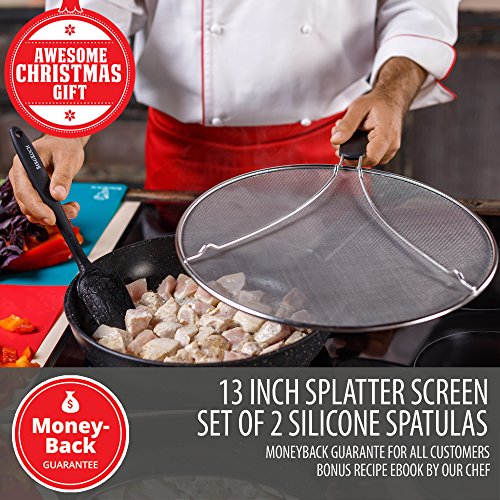 - Set of best kitchen tools for a chef or cooking enthusiast: 13-inch heavy-duty splatter guard for frying pan and 2 silicone high temperature resistant spatulas. Need to replace your old flimsy plastic cookware with professional utensils? Looking for a perfect gift for one special person? You are in the right place!