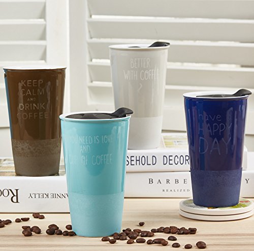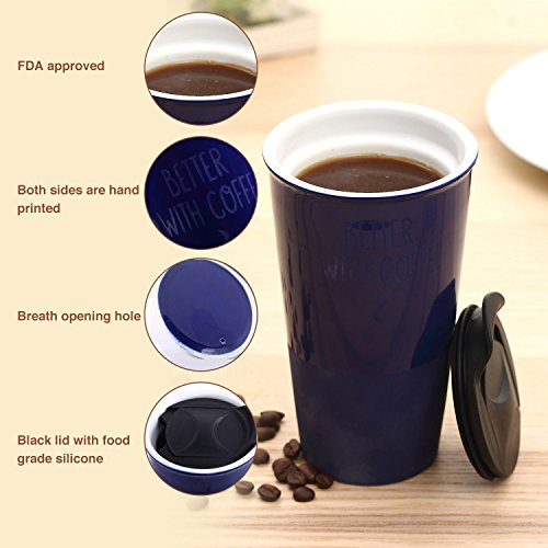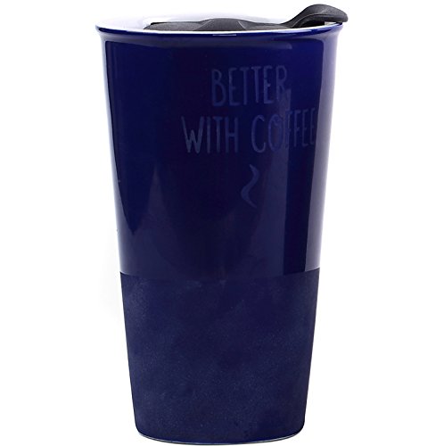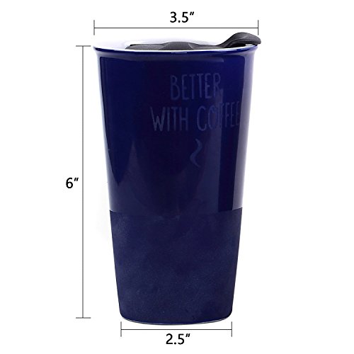 Travel Coffee Ceramic Mug Tea Cup Double Wall Porcelain With Lid 11oz. by CYPRESS, Navy Blue