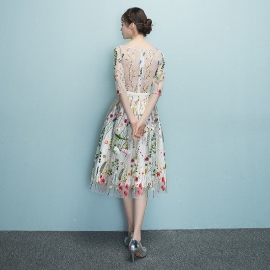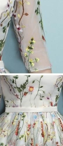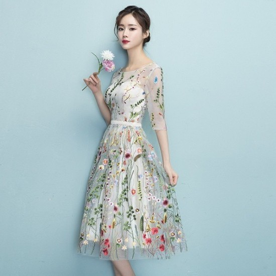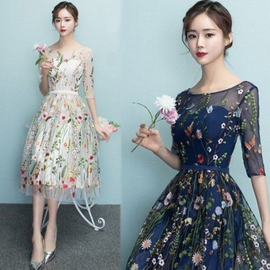 花柄刺繍の、シースルーミモレ丈ドレス。