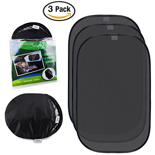 -. Feature : PROTECT KIDS AND BABIES FROM OVER 97% OF THE SUN'S HARMFUL UV RAYS - Our Car Window Cling Sun Shades have a dual layer design. Mesh design 80 GSM (Highest possible) allows viewing through the windows while protecting you from sunlight and keeping your car cooler. / SIMPLE & EASY INSTALLATION - Static Cling back side allows for an easy, repeated application and removal without any adhesives or suction cups. Our sun shade is simple to install. Just place the sun shade on your side windows and run your hand across it. / HIGH WINDOW COVERING - Get maximum UV protection with our 3 pack extra large 21"x14" sunshades for car windows. They fit on most cars: SUVs, Mini and Sedans. Measure the window and see if the size will fit onto your window. / EASY STORAGE - It comes with a free compact travel pouch. When sunshades are not in use, simply deposit them in the travel punch. The travel pouch size is 8" x 7.7" and that's why it is very easy to deposit it in your car. / HEAVY-DUTY and FLEXIBLE WIRE FRAME - Surrounded by a protective wire frame, the sun shade is very flexible and resistant to bending.