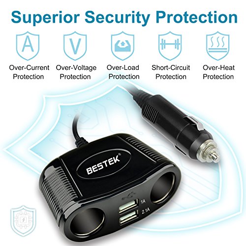 BESTEK Advantage: convert and increase your car cigarette lighter from 1 to 2 sockets as well as 2 USB ports, charging up to 4 devices at once. Excellent Solution for Charging Multiple Devices on the Road.