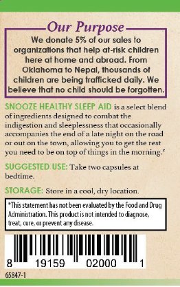 Studio : Forgotten Sprouts Publisher : Forgotten Sprouts Binding : Health and Beauty Product Description Snooze Healthy Sleep Aid is a select blend of ingredients valued for their positive influence on our sleep/wake cycles. Probably the most notable of these is melatonin, which is uniquely combined with three select botanical ingredients known for their calming, soothing attributes. These statements have not been evaluated by the Food and Drug Administration. This product is not intended to diagnose, treat, cure, or prevent any disease. THE FORGOTTEN SPROUTS' PURPOSE: We donate 5% of our sales to organizations that help at-risk children here at home and abroad. From Oklahoma to Nepal, thousands of children are being trafficked daily. We believe that no child should be forgotten. 0
