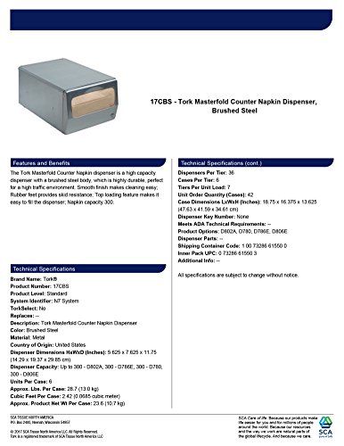 ReleaseDate : 2017-03-12 Studio : SCA Americas LLC Publisher : SCA Americas LLC Binding : Misc. Product Description The Tork Masterfold Counter Napkin Dispenser is a high capacity dispenser with a highly durable brushed steel body. Perfect for a high traffic environment in any restaurant or cafe. Smooth finish makes cleaning easy. Rubber feet provide skid resistance. Top loading feature makes it easy to fill the dispenser. Napkin capacity of 300 napkins. For use with Tork D802A, D780, D786E or D806E Napkins. 0