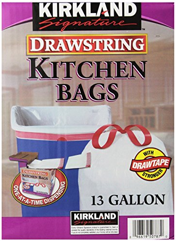 - Feature : Drawstring Kitchen Bags / One-by-One dispensing / 24" x 27" 13 gal / 200 Count / Packaging may vary. The Kirkland Signature Trash Bag has been updated with a new expandable drawsting
