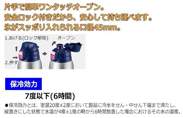 魔法瓶構造でしっかり保冷ができ、開閉ボタン部分には安全ロック付きなので、安心して持ち運べます。持ち運びラクラクな専用ポーチ付きです。 |