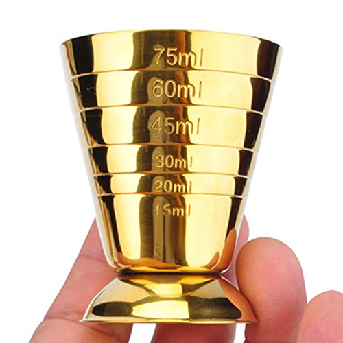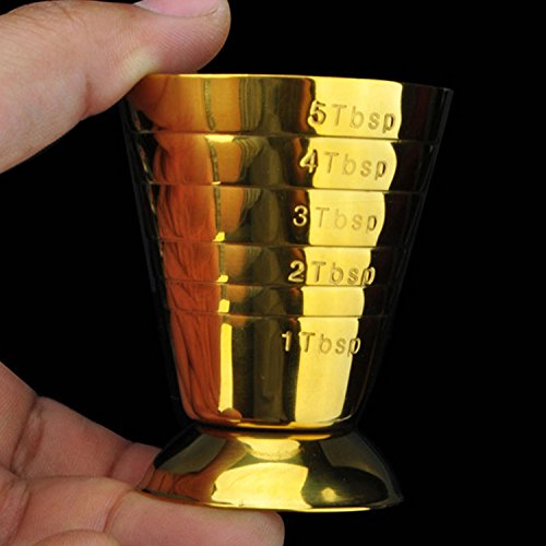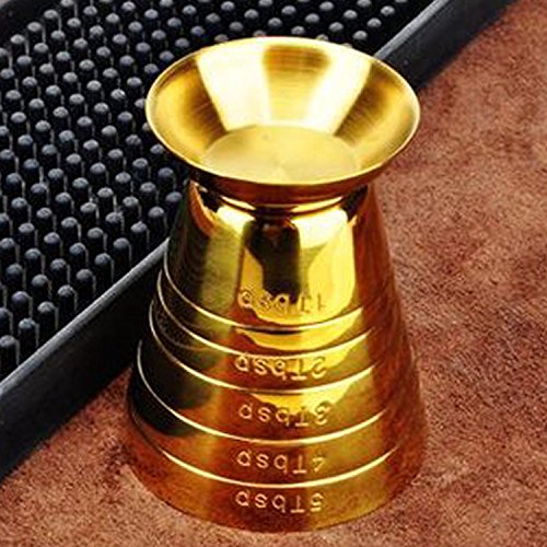 -. Feature : Multi-level measuring jigger cup features measurements of milliliters, ounces, and tablespoons stamped into the jigger perfect when using international measures. Provides efficiency and accuracy when dispensing spirits and alcohol for cocktail bars and clubs; / The handy jigger is made of durable, premium stainless steel, looks with its visible and tangible grades not only appealing, but also enables a fast and safe handling; / With measurements engraved on the outside in ounces, milliliters and tablespoons - and grooves on the inside for easier, more accurate measuring. Displays in ounces, milliliters and tablespoons - 0.5 oz, 1 oz, 1.5 oz, 2 oz, 2.5 oz; 15ml, 20ml, 30ml, 45ml, 60ml, 75ml; 1Tbsp, 2Tbsp, 3Tbsp, 4Tbsp, 5Tbsp; / That means you can pour a variety of amounts, without needing multiple jiggers. So, put on your mixology hat, grab this multi-level jigger, and get creative; / The multi lever jigger will make your drink mixing much more consistent and exact;