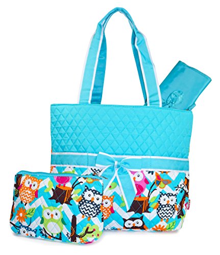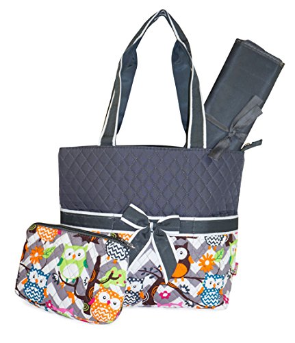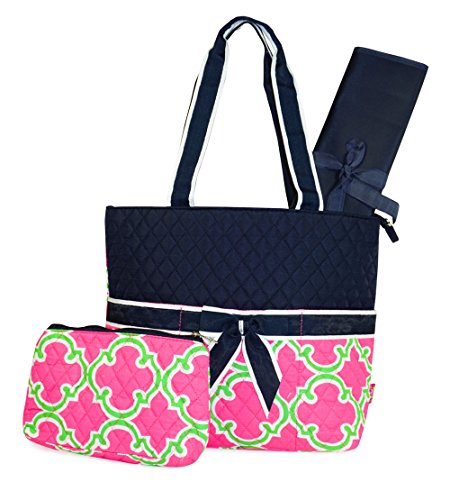 Let everyone know you're a fashion savvy mommy with this large 3 piece diaper bag with matching changing mat and cosmetic bag included. Prepare for your bundle of joy with this trendy carry all bag or buy for the perfect baby shower gift for any stylish mom to be. Travel anywhere confidently and fashionably with this all in one messenger for the chic mom on the go. Made of soft quilted cotton in a trendy print and cute ribbon detail, it features 3 exterior front pockets, 1 exterior zip pocket. All of baby's bottles and binkies will have a place with plenty of interior pockets to keep all that they need organized and at your fingertips. Zip top enclosure keeps Mom's essentials and personal items secure and easily accessible. Sturdy double handles make for easy carrying or are long enough to be slung over the shoulder. It's important to remain a stylish woman while still being a great mom and with this diaper bag, you can do both easily.Feature
