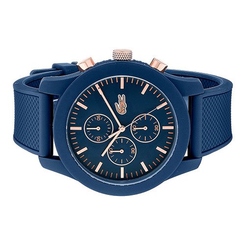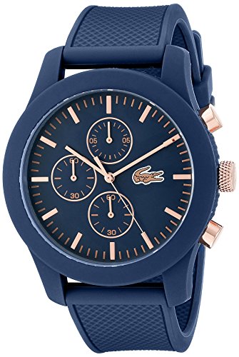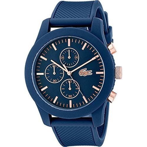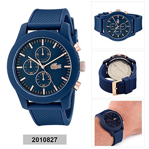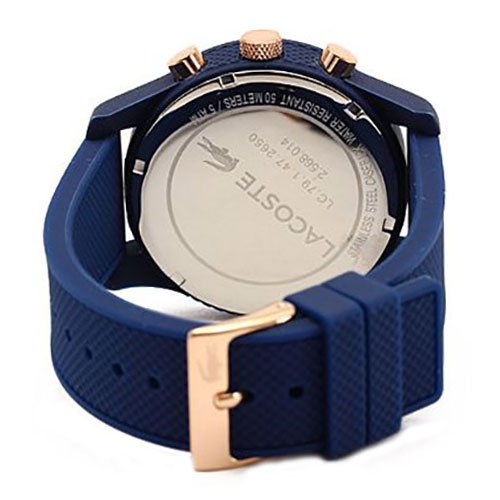 Studio : Lacoste (Movado Group Inc) Publisher : Lacoste (Movado Group Inc) Binding : Watch Product Description Stainless steel case back. Silicone wrapped case. Silicone strap with adjustable buckle closure. Round face, 44mm. Three-hand analog display with quartz movement. Dial features gold-tone hands and hour markers, Lacoste detailing, and three subdials. Water resistant, 5 ATM. Imported. 0