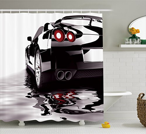 Cars Shower Curtain by Ambesonne, Modern Black Car with Water Reflection Prestige Fast Engine Performance Lifestyle, Fabric Bathroom Decor Set with Hooks, 70 Inches, Black Red White