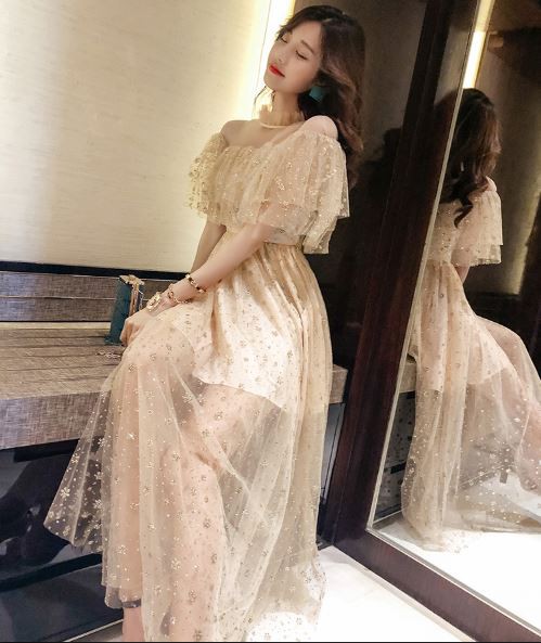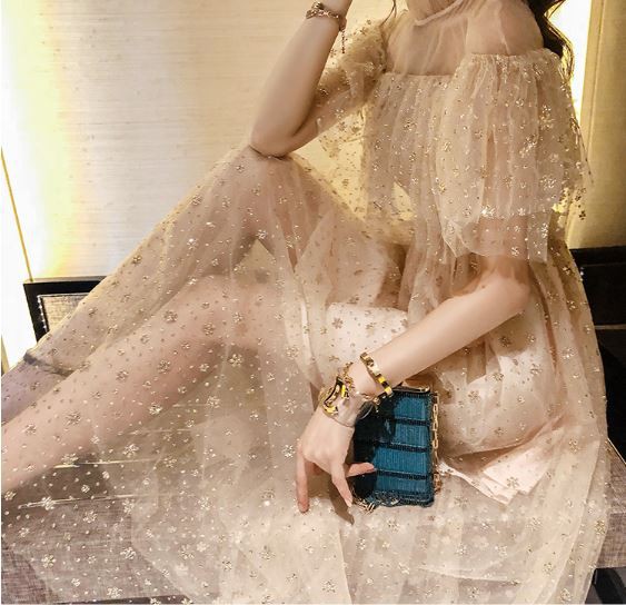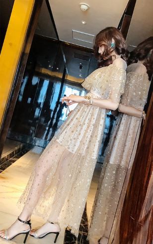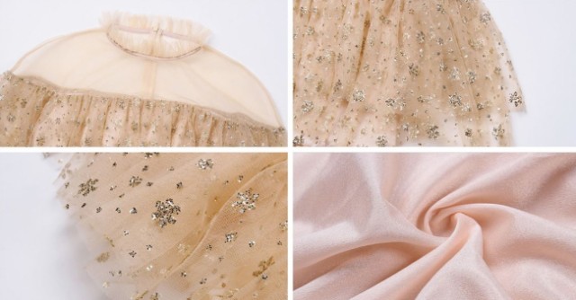 重ねたキラキラレースが華やかなパーティードレスです。