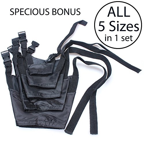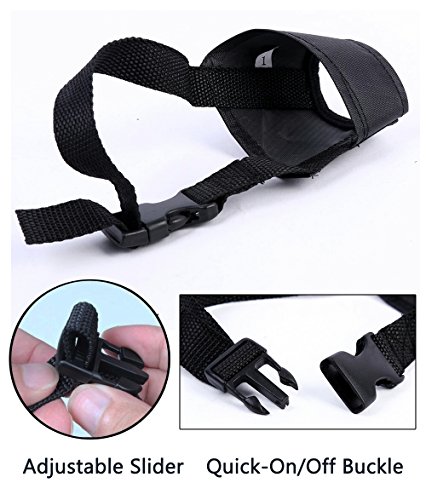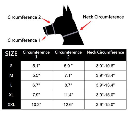Material:strong nylon fabric Colors:Black Package Included:1 Set of 5 different size muzzles Size Guide: # S-Snout Circum- 5.1" to 5.9" Neck- 3.9" to 10.6" # M-Snout Circum- 5.5" to 7.1" Neck- 3.9" to 13.4" # L-Snout Circum- 6.7" to 8.7" Neck- 3.9" to 13.4" # XL-Snout Circum- 7.9" to 11.4" Neck- 3.9" to 15.0" # XXL-Snout Circum- 10.2" to 12.6" Neck- 3.9" to 15.0" Note: Measure your dog's Circumference of snout with mouth slightly open