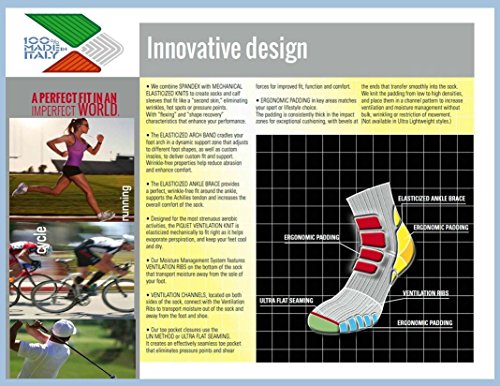 Eurosock 3812 Medium Weight Sport Specific Socks The unique toe-to-heel terry looped padding system makes this a perfect medium weight sock designed to provide comfort and protection Spandex with Mechanical Elasticized Knits Fits like a second skin, eliminating wrinkles, hot spots or pressure points with flexing and shape recovery characteristics that will enhance your performance. Elasticized Arch Band Cradles your foot arch in a dynamic support zone that adjusts to different foot shapes, as well as custom insoles, to deliver custom fit and support with wrinkle-free properties help reduce abrasion and enhance comfort. Ergonomic Padding Ergonomic Padding in key areas matches your sport or lifestyle choice. The padding is consistently thick in the impact zones for exceptional cushioning, with bevels at the ends that transfer smoothly into the sock. We knit the padding from low to high densities, and place them in a channel pattern to increase ventilation and moisture management without bulk, wrinkling or restriction of movement. This feature is not available in Ultra Lightweight styles. Ultra-Flat Seaming The ultra-flat seaming creates an effective seamless toe pocket that eliminates pressure points and shear forces for improved fit, function and comfort. Stay Up System Superior shape retention and a deep heel cup keep the sock from sliding down into your shoes Keep Your Feet Dry and Cool A Dacron Polyester fiber that is renowned in the world of athletics for its moisture management, wicking and drying capabilities. This special four-channel fiber has a unique structure that provides 20% more surface area than ordinary fibers. The result is that moisture is transported quickly, speeding the evaporation process and drying 70% faster than cotton. When knit into a sock with the correct weight, breathability and technical features, users enjoy the benefits of cool dry feet, comfort and performance. CoolMax is a registered trademark of DuPont. Specifically Designed EUROSOCKS specifically designed for serious athletes. Every style is engineered with technical sport-specific features with patented fibers developed through years of exhaustive research. EUROSOCK uses elastic layers that work perfectly together to stimulate blood flow improving oxygen delivery to your muscles reducing foot and leg swelling, lactic acid production and cramping Better Performance Perform better, recover faster, and boost your performance, socks engineered with technical, sport-specific features, just buy a pair and your feet will thank you EUROSOCK Advanced technology, exclusive material and superior craftsmanship weaved together to create the highest quality of socks you will ever wear, Eurosock, by Arcos the leading manufacturer of Vitalsox, Travelsox, Caresox, SOX, and Worksox, Made in Italy 0
