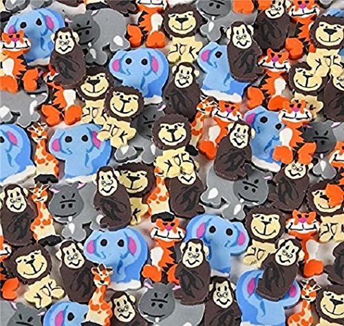 144 pcs of Elephants, Lions, Tigers, Monkeys, Hippos, and Giraffes. This collection of erasers features a variety of zoo animals. An absolute must for animal theme parties. Assortments may vary. For ages 5 and up.