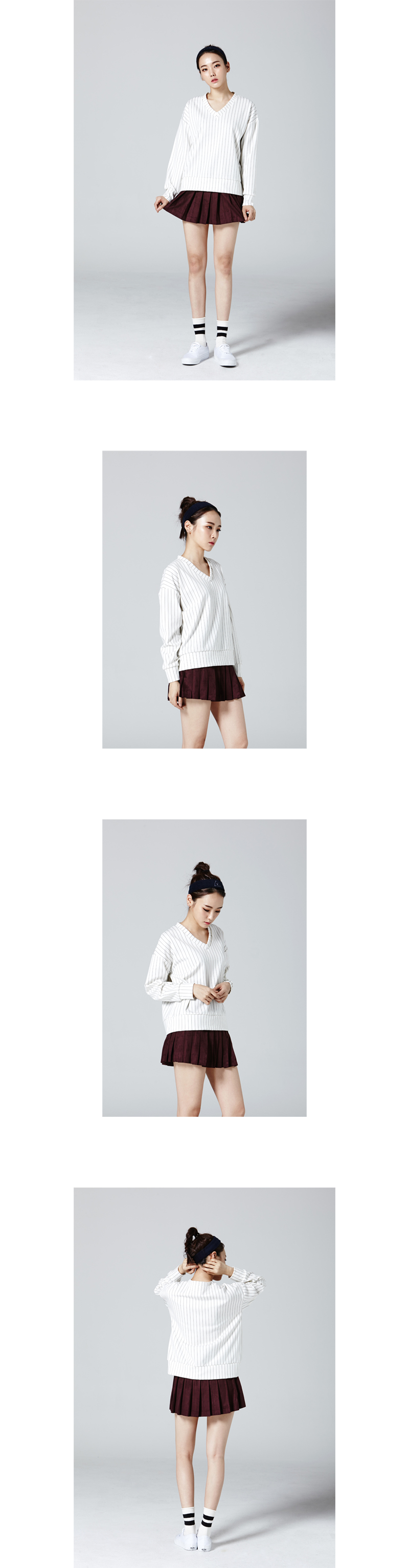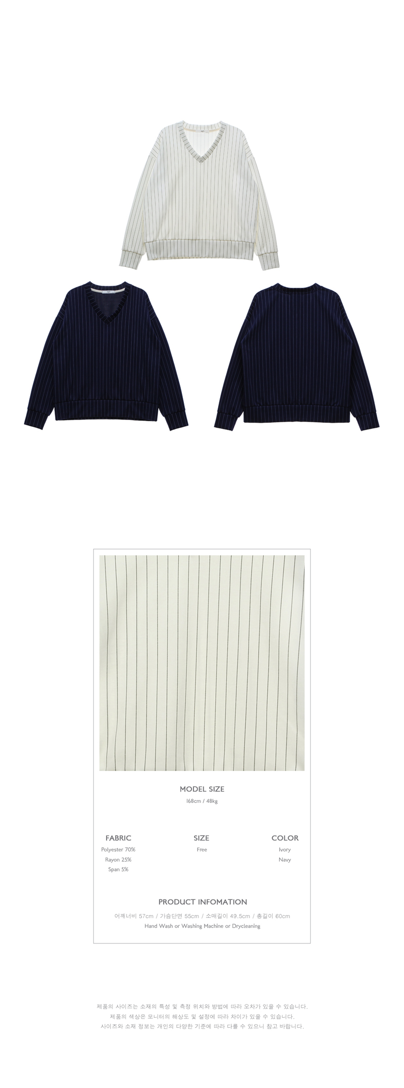 세로 스트라이프로 야구복의 캐주얼한 느낌을 살린 브이넥 맨투맨입니다.