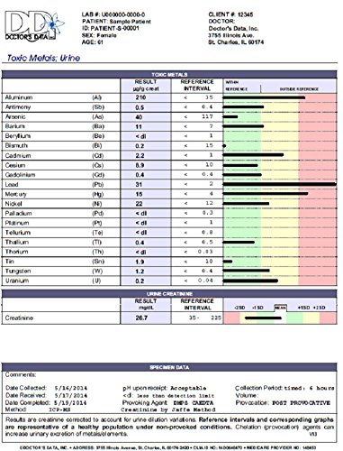 -. Feature : INCLUDES: LEAD, MERCURY, ARSENIC, ALUMINUM, CADMIUM, TIN, URANIUM. / USES A CHALLENGE AGENT TO FLUSH OUT TOXIC METALS. / REQUIRES A 6 HOUR URINE COLLECTION SPECIMEN. YOUR FULL REPORT WILL BE MAILED 2 WEEKS AFTER WE RECEIVE YOUR SPECIMEN. / THE KIT INCLUDES A COLLECTION CONTAINER & AGENT. / THE AMOUNT OF AGENT IS BASED ON YOUR BODY WEIGHT.