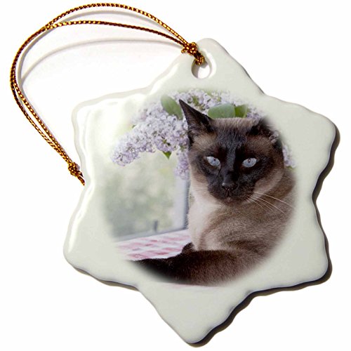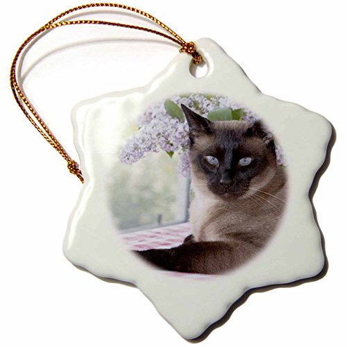 3dRose orn_140344_1 Siamese Cat on Tablecloth with Lilacs NA02 PWO0102 Piperanne Worcester Snowflake Ornament, Porcelain, 3-Inch