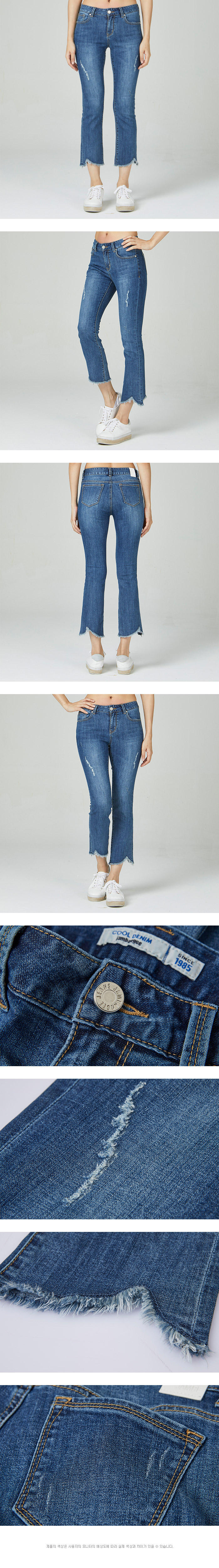 흡습성이 뛰어나 땀을 빨리 배출시켜 시원함을 느낄 수 있는 쿨맥스 소재로 MB톤 인디고 칼라에 바이오스톤과 약간의 구제 워싱이 들어갔고, 밑단 컷팅에 변형을 준 여성 슬림 NE핏 데님 스타일.