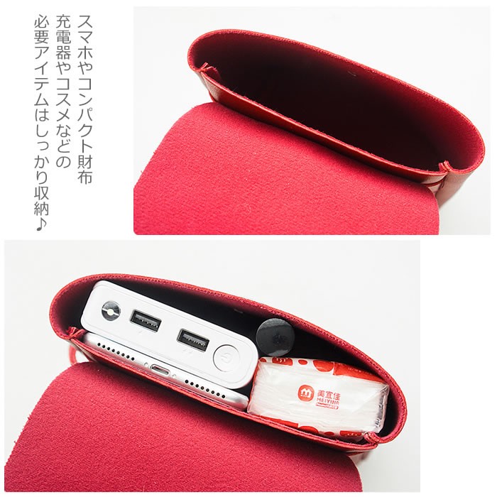 2つ折り財布、携帯、パスケースなどのアイテムが収納できる容量で、