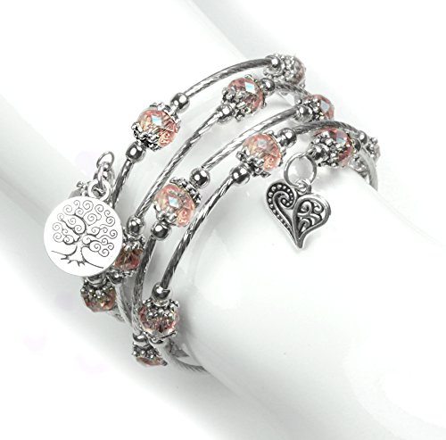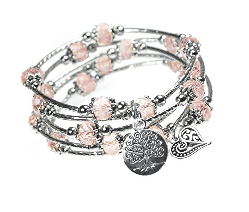 Beautiful beaded 5x wrap bracelet has rows silvertone beads and tubes plus faceted pink beads... and features pretty double-sided ornate heart dangle charm plus a Family Tree of Life charm. Easy on and easy off slip-on triple stack wrap bracelet has no clasps to fiddle with. Comfortable wearing lightweight bracelet has just the right amount of sparkly bling for day or evening. Fits Small to Medium Wrists. Packaged in organza bag.Feature