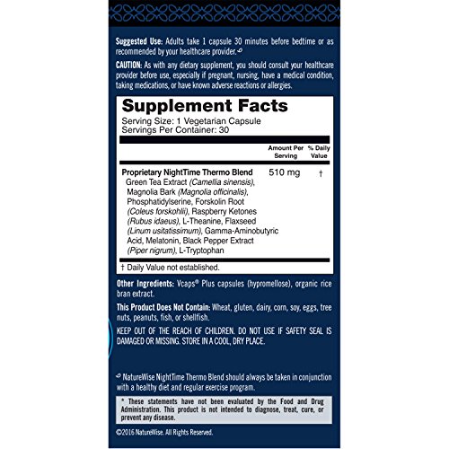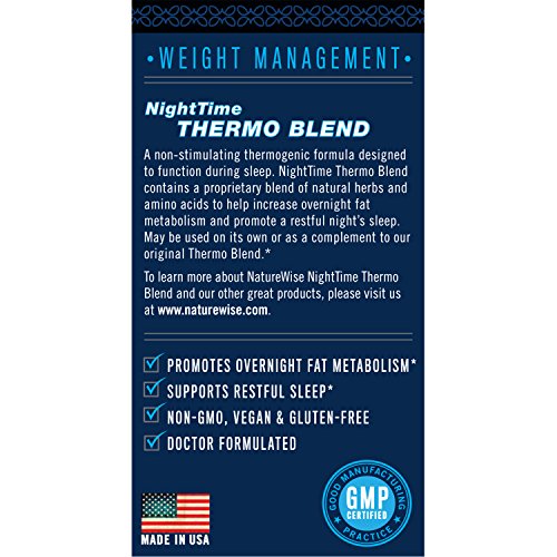 -. Feature : Our advanced NatureWise formula is designed to increase overnight fat metabolism and promote a restful night's sleep - all in one dual-action product! Read below to learn how it works / There is a documented relationship between sleep and weight. Research sests that optimal sleep quality and quantity may contribute to weight loss / Unlike stimulating fat burners, our proprietary blend includes ingredients scientifically shown to enhance REM and sleep continuity. NightTime Thermo Blend may also assist in exercise recovery / Studies continue to support the thermogenic and fat burning properties of EGCG. Early research sests that magnolia bark and raspberry ketones may help reduce fat synthesis to stimulate weight loss / NightTime Thermo Blend may be used on its own or as a complement to our original Thermo Blend. Made in the USA. Non-GMO, vegan, and gluten-free. 30 vegetarian capsules per bottle
