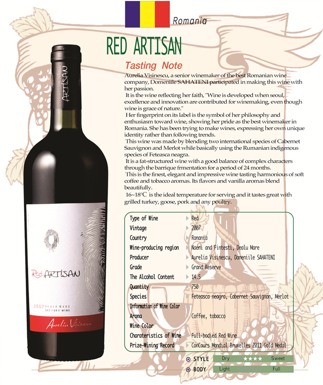This wine was made by blending two international species of Cabernet Sauvignon and Merlot while basically using the Rumanian indigenous species of Feteasca neagra.