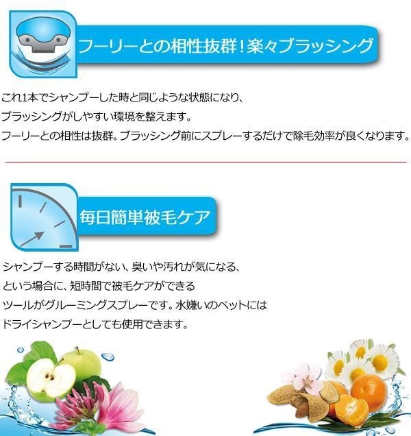 fk094igrjs舐めても飲んでも体に害のない原料を用いていますので、毎日安心してご使用いただけます。グルーミングスプレーは、被毛の汚れを落とすだけではなく、トリートメント効果、抗菌効果、そして保湿効果もあるブラッシング剤。臭いや汚れが気になる前にご使用いただくと、より健康的な皮膚・被毛環境を維持することができ、毎日の暮らしが快適になります。