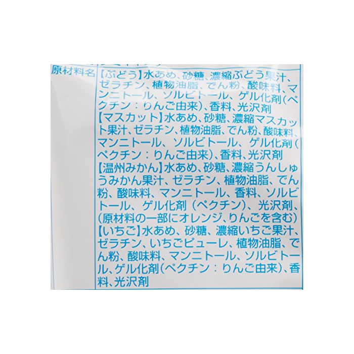 원재료:【# 어떻게(아무리)】물엿,설탕,농축 # 어떻게(아무리) 과즙,젤라틴,식물성 기름지,나오지 않겠 분,신맛료,맨《니토루》,솔《비토루》,겔화 제(백 친:사과 유래)고, 향료,광택 제【머스컷】고, 물엿,설탕,농축 머스컷 과즙,젤라틴,식물성 기름지,나오지 않겠 분,신맛료,맨《니토루》,솔《비토루》,겔화 제(백 친:사과 유래)고, 향료,광택 제【온주귤】고, 물엿,설탕,농축 응 하 #다 지쳐 물어 과즙,젤라틴,식물성 기름지,나오지 않겠 분,신맛료,맨《니토루》,향료,솔《비토루》,겔화 제(백 친)고, 광택 제,(원재료의 일부에 오렌지,사과를 포함한다)【딸기】고, 물엿,설탕,농축 딸기 과즙,젤라틴,딸기 퓌레,식물성 기름지,나오지 않겠 분,신맛료,맨《니토루》,솔《비토루》,겔화 제(백 친:사과 유래)고, 향료,광택 제