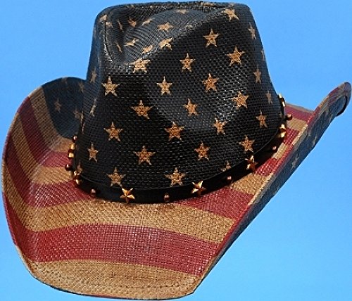 Product Description USA Flag Print Allover Mens Straw Hat Brown. Adult Cowboy Hat with USA Flag Pattern. Elastic Head Band inside for Comfortable One Size Fit. 100% Straw 0