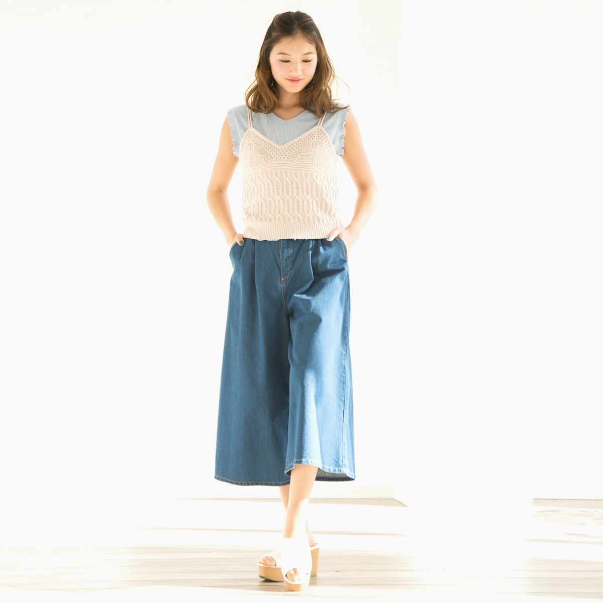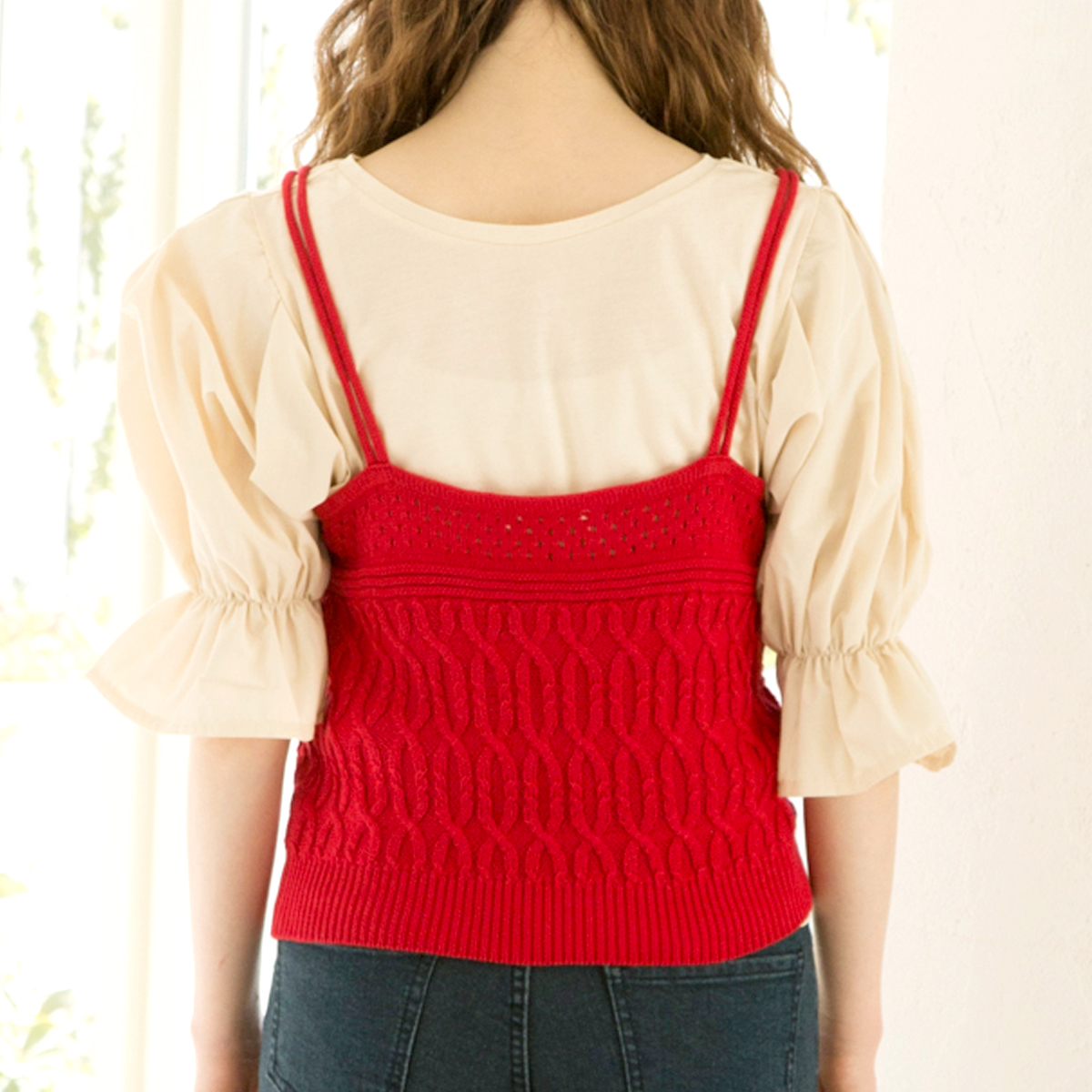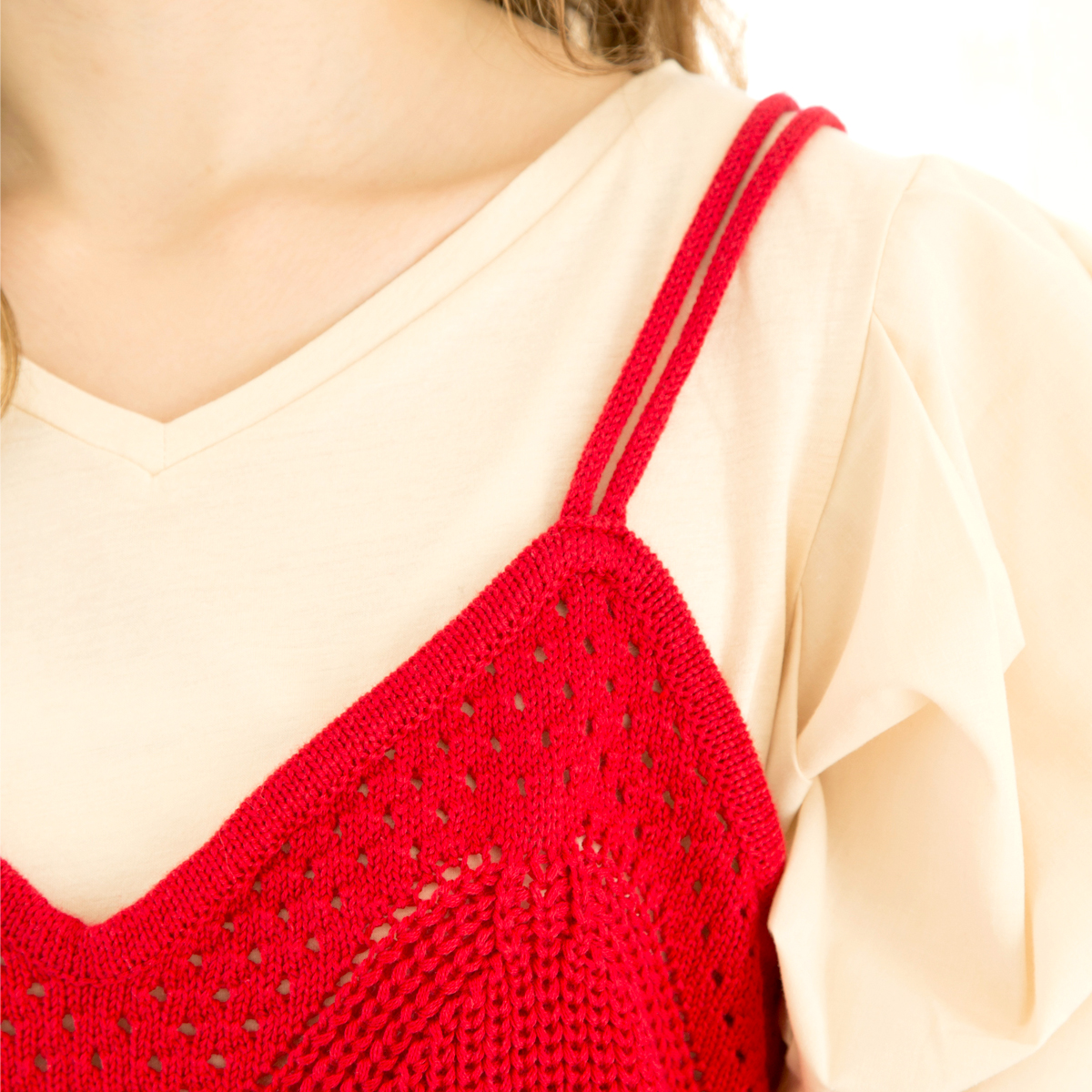 涼しげな透かし柄編み素材で、ニットでもカジュアルでフェミニンな印象に仕上げてくれます。カットソーと合わせたレイヤードスタイルでトレンド感をUP。コーディネートによって、春先から真夏まで活躍してくれる1枚です。