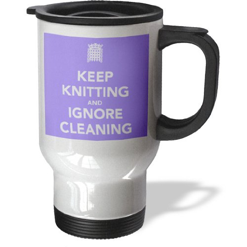 3dRose tm_171980_1 Keep Knitting & Ignore Cleaning, Purple Stainless Steel Travel Mug, 14 oz, White