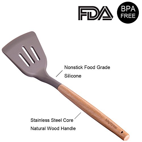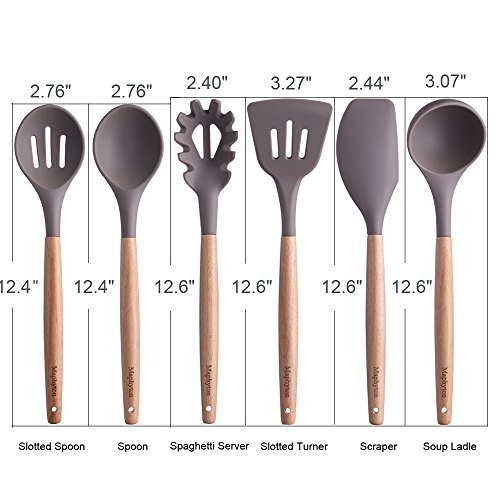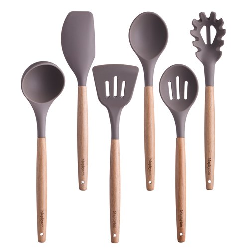 Silicone Cooking Utensils, Maphyton Nonstick Heat Resistant Kitchen Utensil Set BPA Free with Natural Wood Handle (6, Grey)