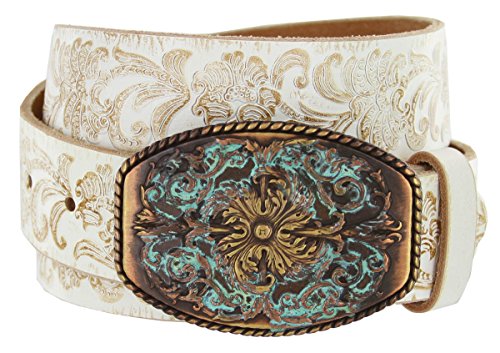 -. Binding : Apparel -. Brand : Belts.com -. Department : mens -. Feature : Full Grain 100% Leather 1-1/2"(38mm) wide / Floral Embossed Leather Jean Belt Black, White, or Brown / Buckle Size: 3 1/2" x 2 3/8", Antique Patina Finish Buckle / Belt has snaps so Buckle is removable and changeable. / Sizing: Measure around where you wear the belt and order that size -. ProductGroup : Apparel -. ProductTypeName : ACCESSORY -. Title : Men's Western Tooled Full Grain Leather Jean Belt Black Brown 1.5" Wide