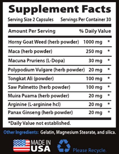 - Feature : Each Serving Contains 1000 mg of Horny Goat Weed / 250 mg of Maca Root Extract Per Serving / Supports Hormonal Balance / Powerful Formulation Shown to Provide Amazing Results / "Empty Bottle Guarantee" Use the Whole Bottle and If You Are Not Satisfied Simply Contact Us For a Full Refund - Nothing to Return!