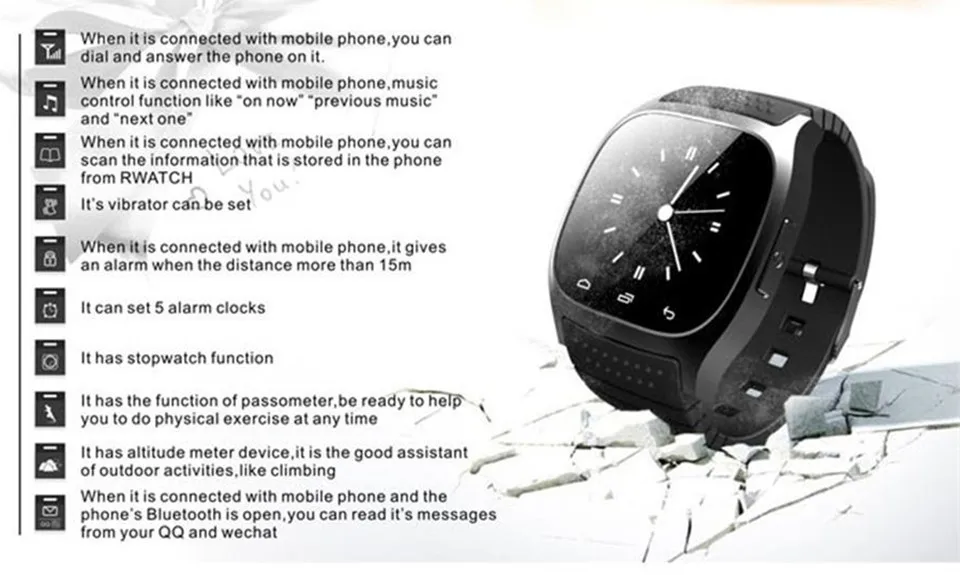 Function:Chronograph,Answer Call,Calendar,Week,Remote Control,Dial Call,Alarm Clock,Month,Push Message,Passometer,Message Reminder,24 hour instruction,Call Reminder