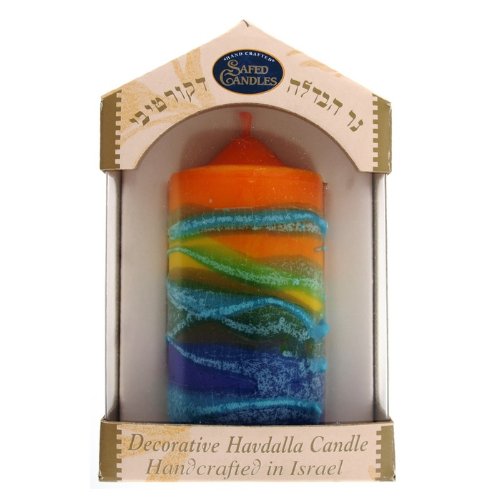- This Pillar Havdalah Candle from Safed Candles features bright stripes in orange, yellow, blue, green and violet and is overlaid with turquoise blue lines.