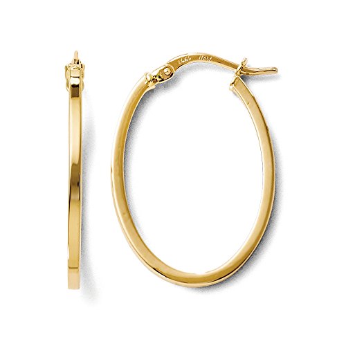 Simplicity offers versatility and timeless appeal. Designed from polished 14k yellow gold, these oval hoop earrings feature a square-shaped hollow tubing that measures approximately 1.5mm in thickness, 19mm (3/4 inch) in width by 26mm (1 inch) in length. Made in ItalyFeature