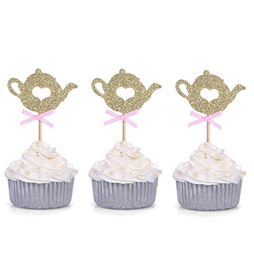 Set of 24 Golden Glitter Teapot Cupcake Toppers Tea Party Baby Shower Picks - by Giuffi