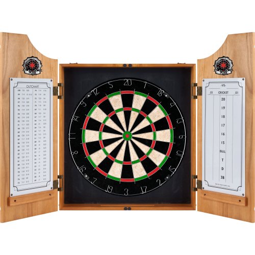 ReleaseDate : 2013-01-29 Studio : Trademark Global Publisher : Trademark Global Binding : Sports Product Description Bring the game to your game room, garage or collection with an officially licensed beveled wood dart cabinet. Enjoy competition among friends while pre-gaming, during halftime, or at the after party . The officially licensed beveled wood dart cabinet comes with everything you need for a great game. It includes a high quality, self healing sisal fiber dartboard, six steel tipped darts, dry-erase scoreboard, out chart, marker and mounting supplies. With an officially licensed beveled wood dart cabinet you’re guaranteed to have fun no matter what the score! 0