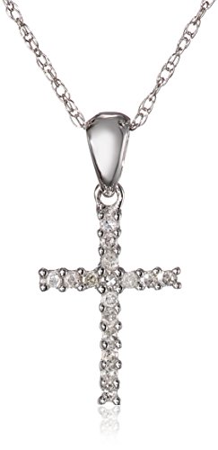 The elegant 10k White Gold Cross Diamond Pendant is an ideal choice for reflecting your faith with cultured fashion. A 10k white gold setting imparts the pendant with a sense of gleaming authority in a quality construction. Laced throughout the body of the cross, 16 natural, round-shaped, white diamonds in four-prong settings unleash a glistening spectacle of dignified resonance. Included is an 18-inch rope chain with a spring-ring clasp for added security. Equally rich in contents and spiritual representation, the tasteful cross pendant is as at home with church services as it is with your everyday endeavors.Feature