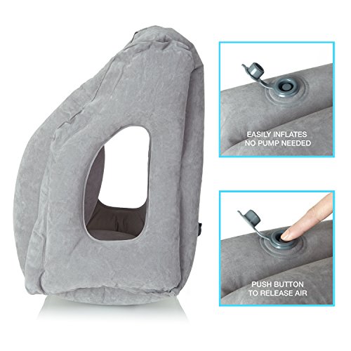 INFLATE AND DEFLATE IN LESS THAN 30 SECONDS Our inflation value has a built in release valve created with convenience in mind. It will continue holding air as you inflate it until you press the release valve button to begin deflating the travel pillow.