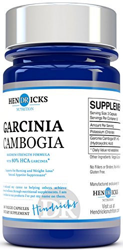 -. Binding : Health and Beauty -. Brand : Hendricks Nutrition -. EAN : 0641871637539 -. Feature : INDUSTRY LEADING FORMULA: Contains only 100% PURE Garcinia Cambogia Extract with maximum strength 80% hydroxycitric acid (HCA) studied for its potential to reduce appetite, decrease body fat, and help prevent weight gain. HCA has also been studied for its impact on serotonin, and neurotransmitter responsible for mood boosting effects. Stay positive, motivated, and focused while pursuing your weight loss goals! / SAFE AND EFFECTIVE: Benefit from added potassium that helps increase bioavailability and absorption in the body, and experience maximum efficacy with a formula free of fillers, binders, preservatives, GMOs, magnesium stearate, silicon dioxide, or calcium, which may even block absorption of HCA. / DOCTOR FORMULATED: Dr. Jeffrey Hendricks, a practicing physician and biochemist, set out to develop industry leading nutritional supplements based on his years of clinical practice and research. Hendricks Nutrition uses clinically studied ingredients and each formula is inspired by the cutting edge work of Dr. Hendricks in the Nutraceutical field giving you and advantage previously unseen in the supplement industry. / MANUFACTURING MATTERS: As Chief Medical Advisor for the FDA approved cGMP facility that manufactures his supplements, Dr. Hendricks plays a role in ensuring that every product is formulated under the strictest quality standards and passes multiple levels of third party purity and potency testing. / FULLY BACKED BY OUR 90 DAY GUARANTEE: If for any reason you are not fully satisfied with one of our products, simply send us your empty bottle for a full refund, no questions asked. -. Label : Hendricks Nutrition -. LegalDisclaimer : These statements have not been evaluated by the Food and Drug Administration. This product is not intended to diagnose, treat, or prevent any disease.Actual product packaging and materials may contain more and different information than what is shown on our website. We recommend that you do not rely solely on the information presented and that you always read labels, warnings, and directions before using or consuming a product. Please see our full disclaimer below. -. Manufacturer : Hendricks Nutrition -. ProductGroup : Health and Beauty -. ProductTypeName : HEALTH_PERSONAL_CARE -. Publisher : Hendricks Nutrition -. Studio : Hendricks Nutrition -. Title : 80% HCA Pure Garcinia Cambogia Extract - 100% Physician Formulated, Next Generation All Natural Appetite Suppressant and Weight Loss Supplement with Potassium - No Calcium -- Zero Fillers or Binders, No Artificial Ingredients, Non-gmo --180 Vegetarian Capsules - Full 30 Day Supply -- Manufactured in an FDA Approved GMP Certified Laboratory, Made in the USA and Formulated By Dr. Hendricks (Packaging may vary) -. UPC : 641871637539