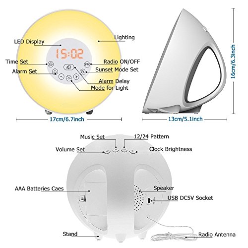 7 Changing Night Light: Touch the color key to choose your favorite color, including warm white,green, red, blue, purple, orange and indigo; 6 sounds alarm clock: 6 natural sounds such as forest, birds, wave and so on which can let you feel the beauty of the nature