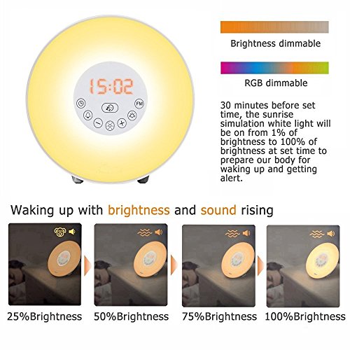 Sunrise Simulation Wake Up Light: 30 minutes before your alarm time, light gradually brighten from 10% of brightness to 100% and gently bring you out of a deep sleep, and feel energetic at the start of your day; Setting snooze mode and alarm time with easy-to-use touch keys