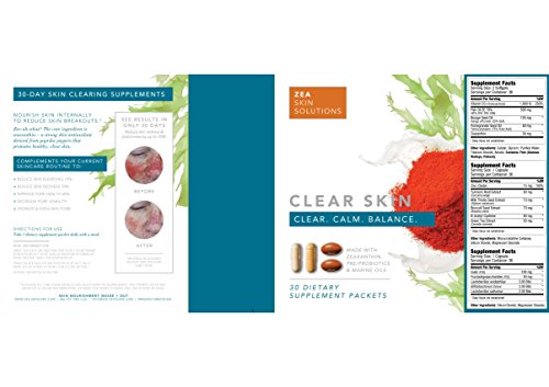 Calm. Clear. Balance. These Dietary Supplements Help To Knock Out Blemishes, Even Skin Tone, And Calm Dry Sensitive Skin. Rich In Antioxidants, Marine Lipids And Powerful Skin Pre And Probiotics With The Exclusive Skin Antioxidant Zeaxanthin, The Clear Skin Supplements Are Based On Leading Skin Nutrition Science And Formulated With Naturally Derived Ingredients And Powerful Skin Probiotics. Each Package Contains Easy To Use 30-Day Supply Of The Dietary Supplement Packets. Zea Skin Solutions' Supplements Combine The Proprietary, Extremely Powerful Antioxidant, Zeaxanthin, With Complementary All-Natural Ingredients To Combat Blemished Prone Skin. Zss'S Mission Is To Continue To Develop Innovative Products That Are Science-Driven, Rooted In Nature - Supporting Healthy Skin, From The Inside And Out. The Patented Products Are Manufactured In The Usa. All Zss Products Use Naturally Derived Ingredients And Are Free From And Are Free From Harsh Chemicals, Additives, Fillers And Gluten.Feature